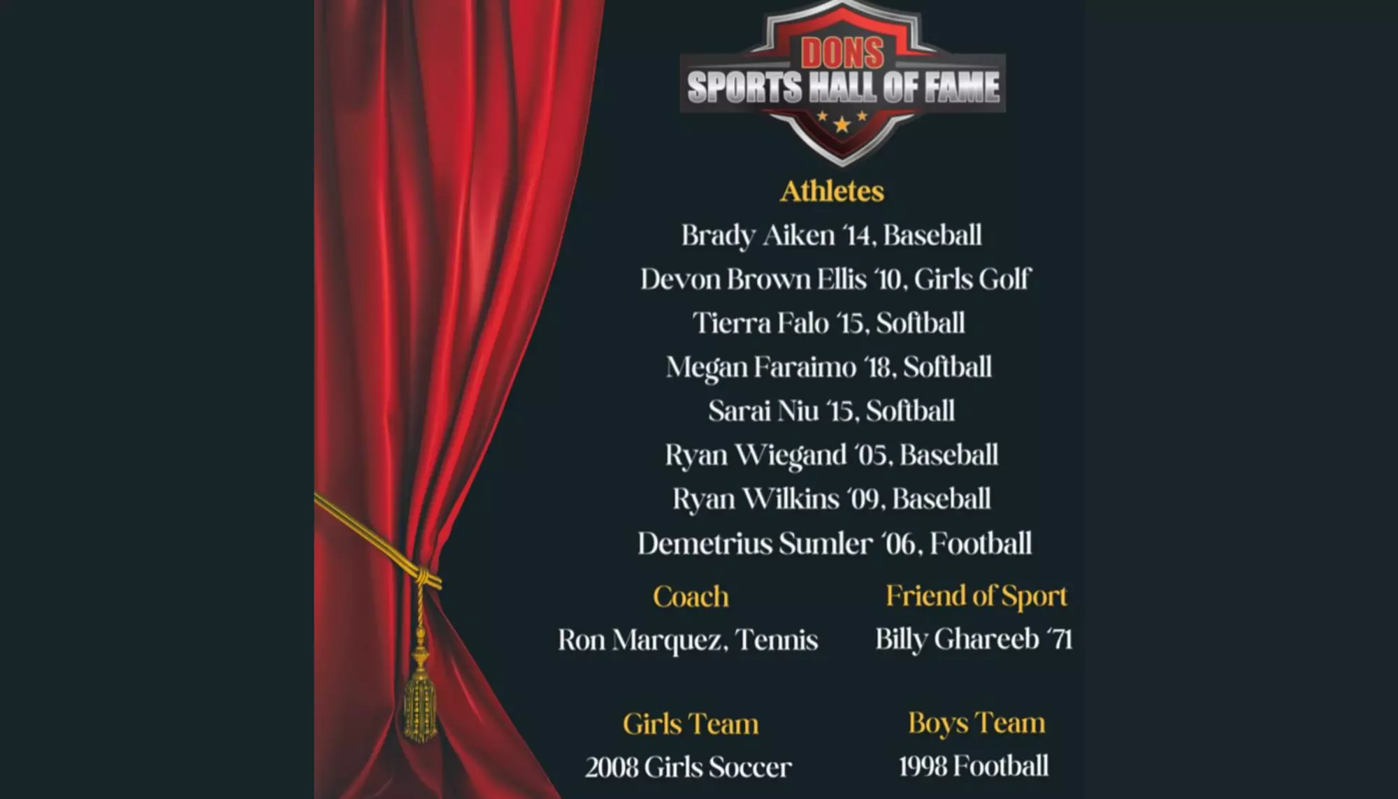 The purpose of the Dons Sports Hall of Fame is to pay tribute and extend recognition to those individuals who, through the years, have contributed to the honor and fame of the Dons Athletic Program in the field of athletics and who have continued to demonstrate, in their daily lives, the values learned in athletics. We also recognize those who have contributed to the success of the individual or team through meritorious service or inspiration. Members of the Dons Hall of Fame either attended Cathedral Girls High School, University of San Diego High School, Cathedral Catholic High School, or are friends of the Dons.