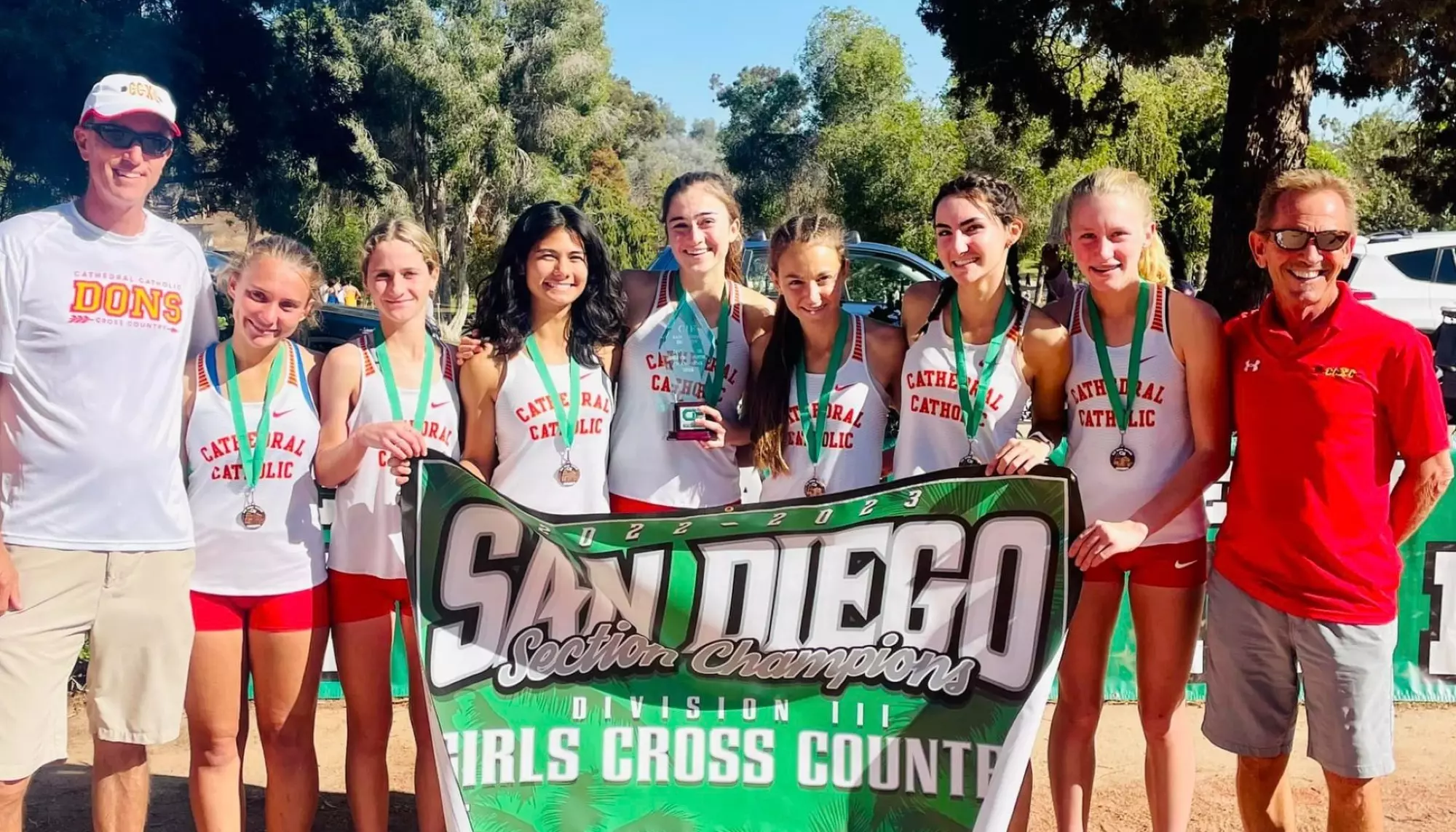 This morning the Cathedral Catholic girls’ and boys’ cross country teams competed in CIF finals racing 2.96 miles at Morley field. The girls’ team scored the lowest with 43, besting the second place finisher by 15 points, winning Division III for the 3rd consecutive year (no championship during 2020 COVID season)! The young boys’ team finished 6th as a team, with 3 runners finishing in the top 20.